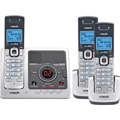 The Vtech DS6121-3 DECT 6.0 Digital Cordless Phone System with Three Handsets and Digital Answering System provides the utmost in sound quality and convenience for a home or office. The DS6121-3 runs on the DECT 6.0 frequency band for superior sound quality and range. DECT 6.0 is not compromised by common home appliances; wireless networks will not disrupt or be disrupted by it; and hackers cannot eavesdrop on it as easily as older frequency bandwidths.The DS6121-3 includes three handsets (along with a base and two charging cradles) that let you use all handsets through a single phone jack. You can intercom between handsets and calls can be transferred between them -- no more shouting, "It's for you!" You can also conference an outside call between them. Speakerphones are built into each handset, allowing you to enjoy hands-free conversations wherever you roam. The large blue backlit display makes menu navigation simple. A 50-name-and-number phonebook directory stores and dials frequently called numbers, and the phone is caller ID/call waiting compatible.